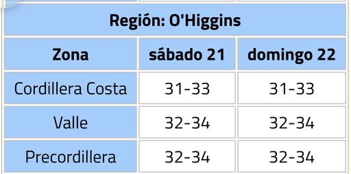 La Dirección Meteorológica de Chile, emitió un ‘aviso meteorológico’ vigente desde la tarde del próximo sábado 21 de febrero hasta el dominngo 22 del mismo mes, por altas temperaturas que afectarán a varias regiones, entre ellas O’Higgins.